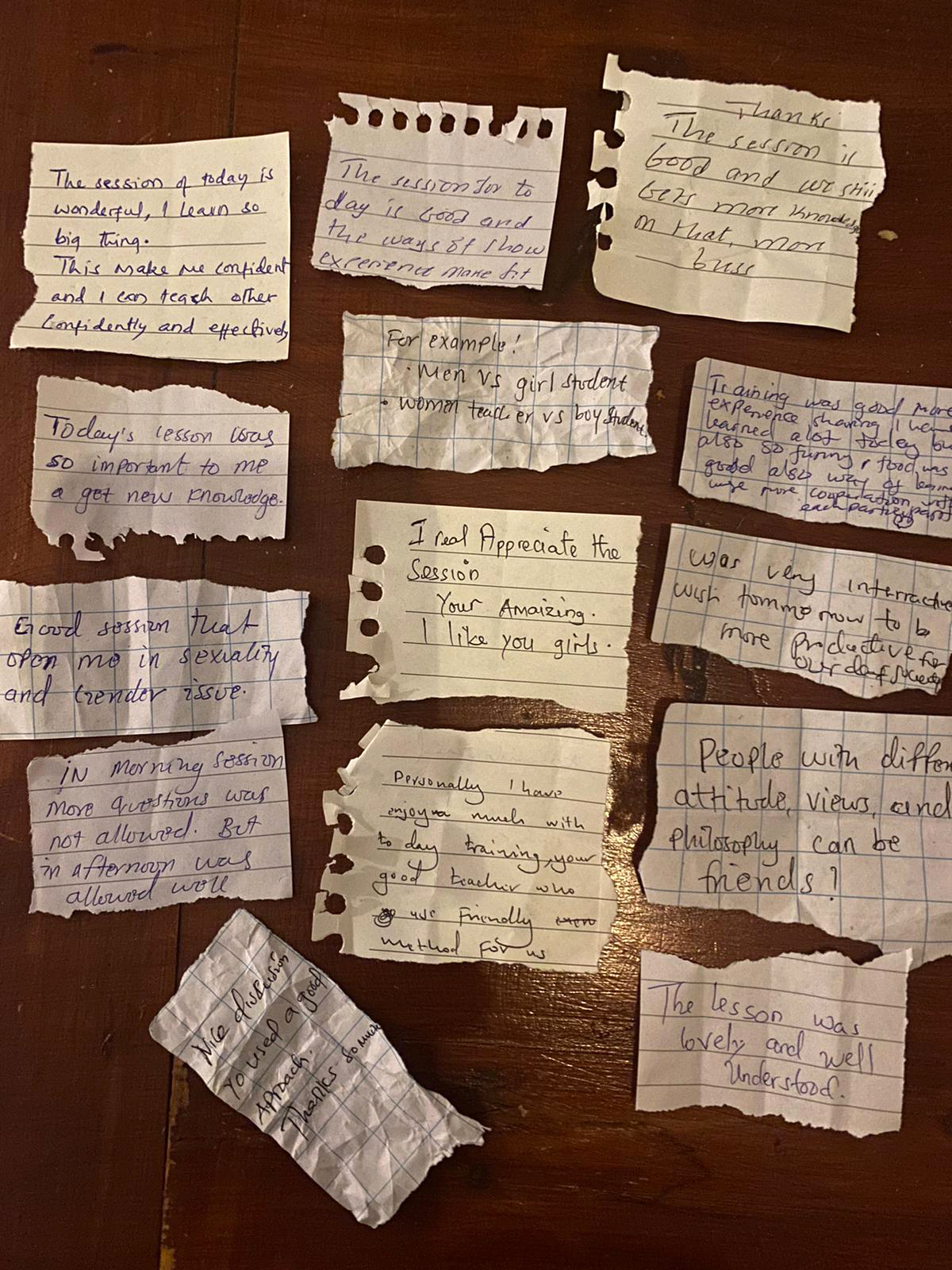 Me kouluttajat tapasimme ensimmäistä kertaa lentokentällä, ja iloksemme oli heti selvää, että yhteistyö toimisi. Taika toi koulutuksen sisältöön ammatillista asiantuntemusta, kun taas Jenni tuki fasilitointia ja ohjasi keskusteluja. Dynamiikka toimi erinomaisesti ja loi vahvan perustan koko koulutusviikolle. Koulutus järjestettiin nelipäiväisenä kokonaisuutena, joka käsitteli muun muassa kehollista itsemääräämisoikeutta, seksuaaliterveyttä, kuukautisia ja kulttuurisia näkökulmia haastaviin aiheisiin.